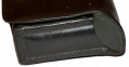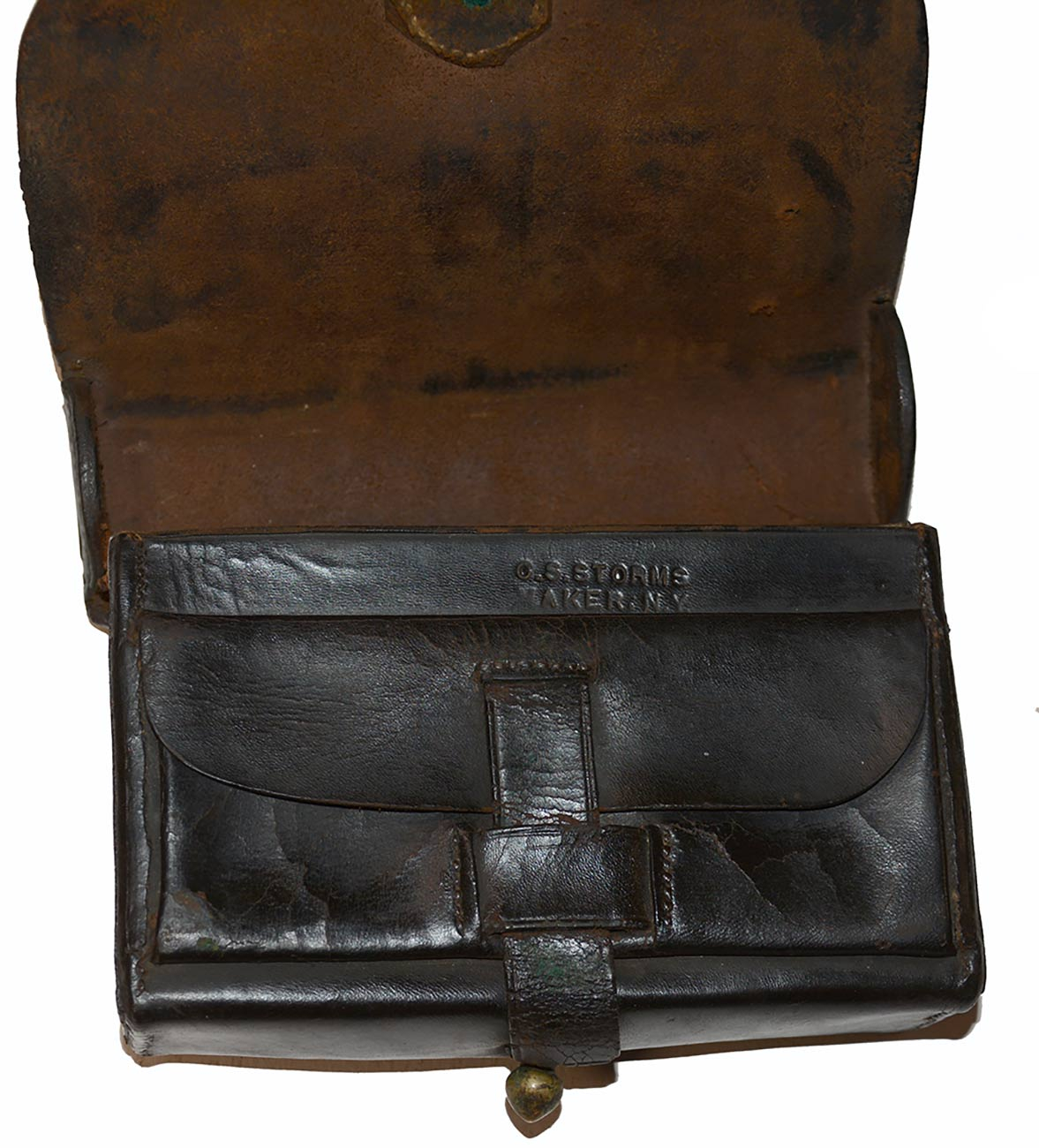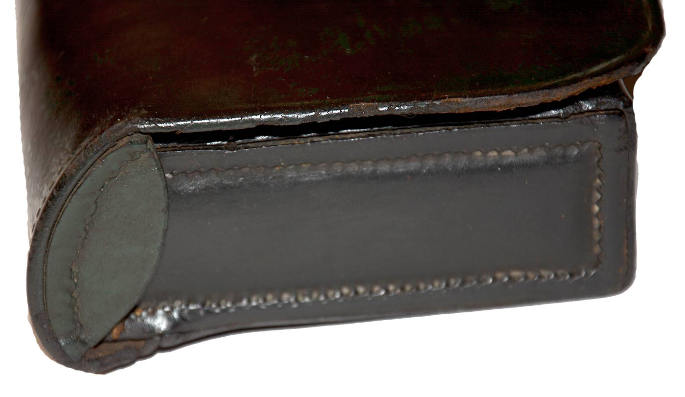This specimen is constructed of strong, black bridle leather. When closed, the large leather outer flap protects the ammunition within. The single long tin, with four compartments, is present. The strong outer flap has a tooled front edge with two “ears” firmly stitched in place. Leather is excellent. There are two small holes near the right edge of the outer flap. Stitched and riveted to the outer flap is a closure tab that remains unbroken.