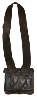 Box is for carrying the .58 caliber rifle musket cartridge. Outer flap is in good condition. The leather is clean and smooth with an oval “US” plate attached by a leather thong. The face of the plate is clean with a good “US” stamping with a terrific dark patina. Just under the plate is a hole that looks very much like an Austrian bayonet was pushed through. The latch tab that was attached by a single row of stitching is missing which may have something to do with the bayonet hole.