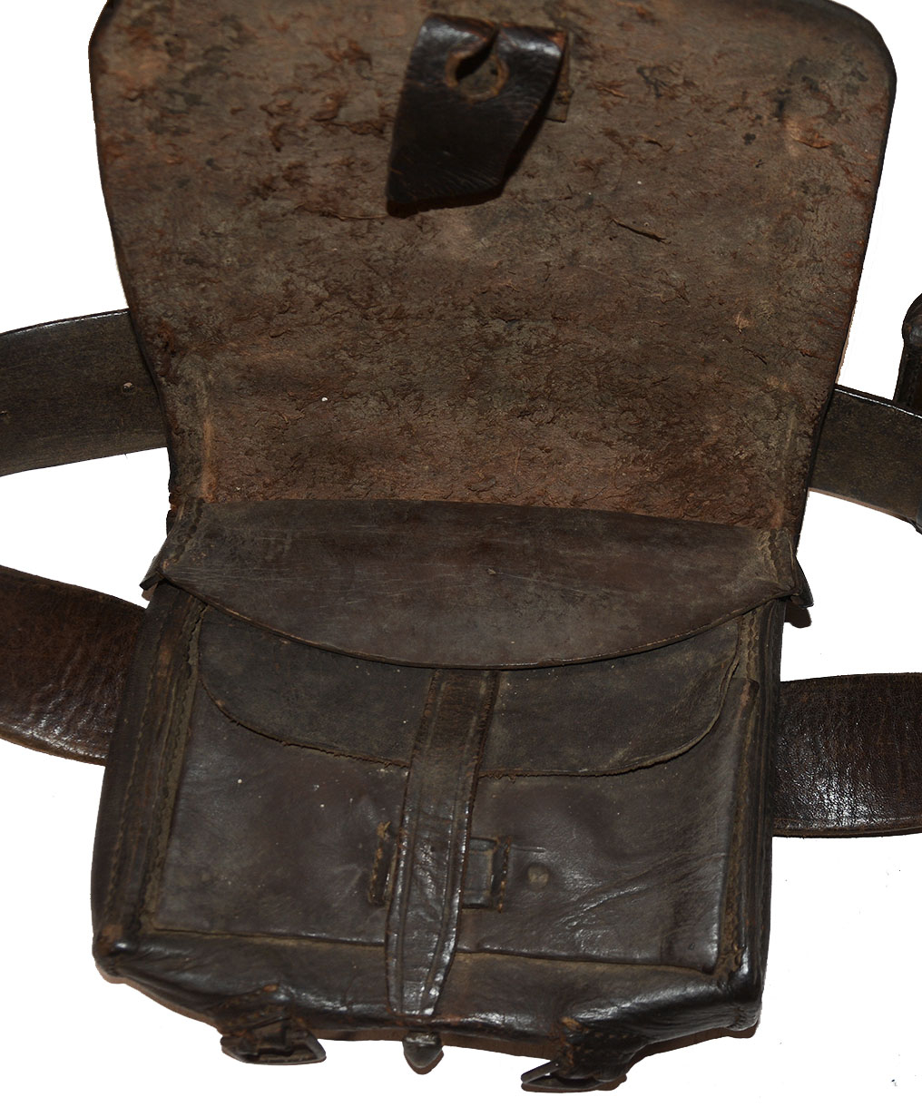 The leather Confederate made cap pouch is mounted on the right front area of the belt. Its superb condition matches the belt and the cartridge box. It has a single 2-inch-wide loop in back and a lead finial. There is the factory wool, and a good bit, still inside this cap pouch. This set was in one of the finest collections of Confederate material ever assembled. The back story is that it came from Devil's Den having been found immediately after the battle of Gettysburg. A wonderful set! [pe]