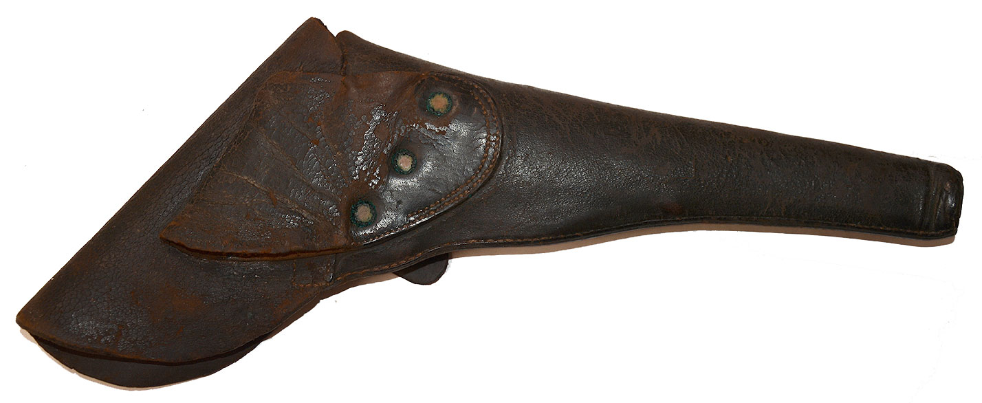 Civil War cavalrymen were typically armed with saber, pistol, and carbine, though it took some time to get regiments fully armed with carbines. This is a very good military issue holster, with full flap and configured to ride on the trooper’s right side with the butt forward. This would be a key part of a cavalry display, nicely complete a good condition cavalry belt rig, and look great alongside a .36 Cal. revolver, standard issue for cavalry along with the .44. [sr][ph:L]