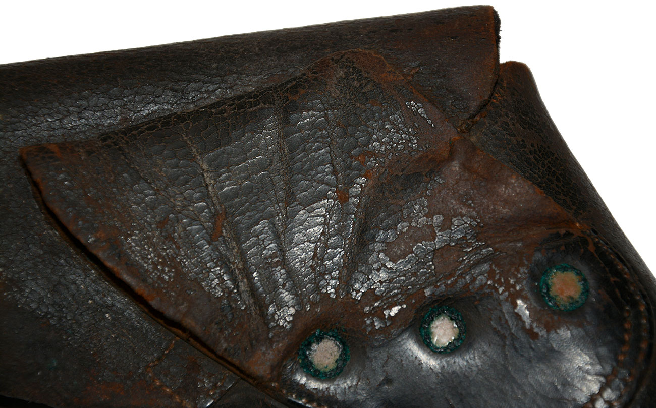 The latch tab is full length and secure. The single, straight line of stitching securing it is a sign of early war construction, with a rivet reinforcement added mid-war and the stitching then also changed from a straight line to a semicircle around the rivet. The leather has good body, not hard and not flimsy, still showing the impression of a revolver it must have housed for some time. The toe plug is also complete and tightly in place with the stitching intact. These have often been pushed out by the muzzle of the pistol.