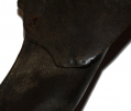 The holster shows use, but the leather is solid, the seams tight and the finish is good. It has a single narrow belt loop on the back, secured at the bottom by a single rivet. The flap is large and shows two holes to fit over a finial fixed to the upper rear edge of the holster body. This finial was lost at some point and has been replaced by a simple wood screw. One of the holes is likely the original to fit over the finial. (We see no signs of stitching for a latch tab, though it could have been held by a rivet in one of holes.) The lower tip of the flap seems to have been scalloped and a line of stitching holes indicates the edge may have been bound. At some point in its use one tip of that scalloped edge was trimmed, likely to make it conform to a different revolver or one that had settled into the holster. We note that the forward upper edge of the body has been worn from the hammer and recoil shield rubbing against it and there is a short horizontal tear at the bend of the flap, and the toe plug is gone, indicating the pistol may have begun to ride lower in the holster and the owner may have simply tried to make the flap fit tighter.
