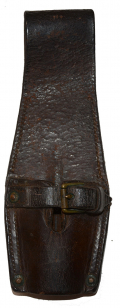 This cartridge box measures about 5-1/2” wide, 3-1/2” tall, and about 1-1/2” front to back, making it likely a box for pistol cartridges. It is made of brown leather with the outer flap having… (490-7194). Learn More »