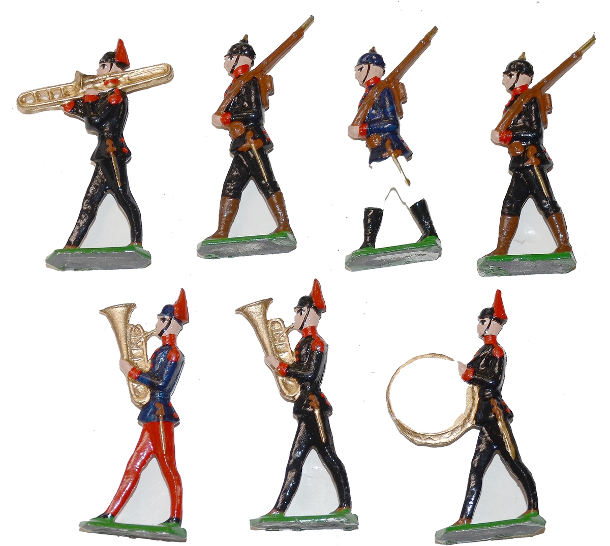 The lot contains 7 two-sided soldiers hand painted and dressed in the blue German uniform of the 1880’s-90’s. Each meas. approx. 3.00 inches tall. 5 of the figures have dark blue trousers while one has white and another red. All wear dark blue tunics and dark pickelhaubes. 4 of the figures are bandsman, one plays the trombone, two play Baritones and one a bass drum. The other three figures carry rifles at todays “left shoulder arms” position.
