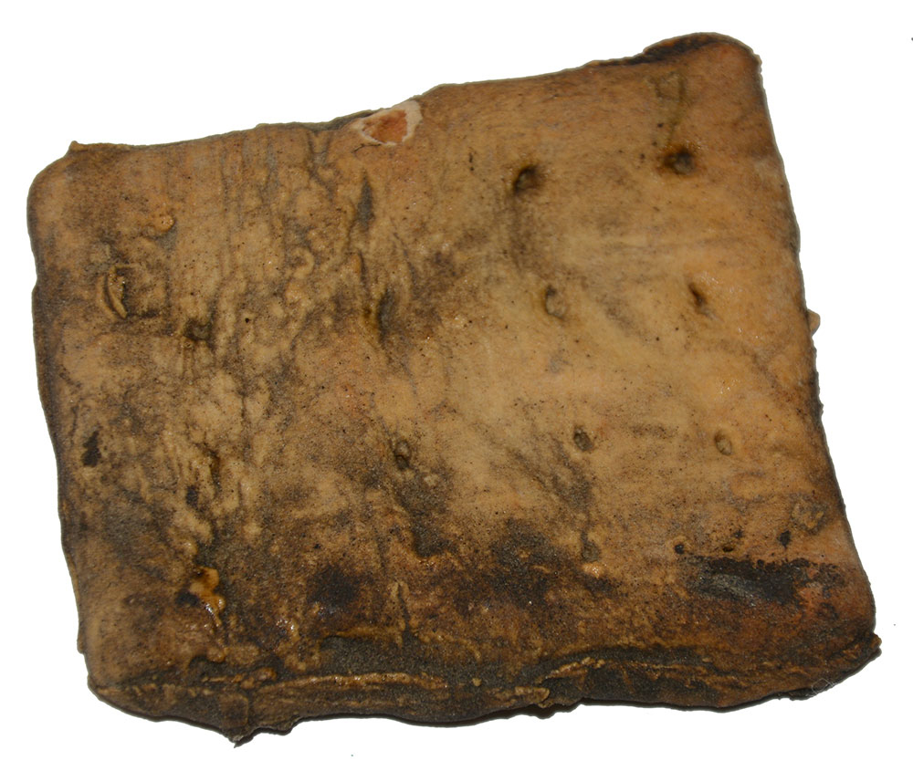 An intact piece of the infamous Civil War soldier’s ration, hardtack. A plain flour and water biscuit, this example is an uneven shape and measures roughly 3” x 2.75” with the typical rows of “cracker holes”. This piece is in good, solid condition, but is somewhat dirty. Reportedly found in a South Carolina soldier’s knapsack.