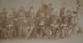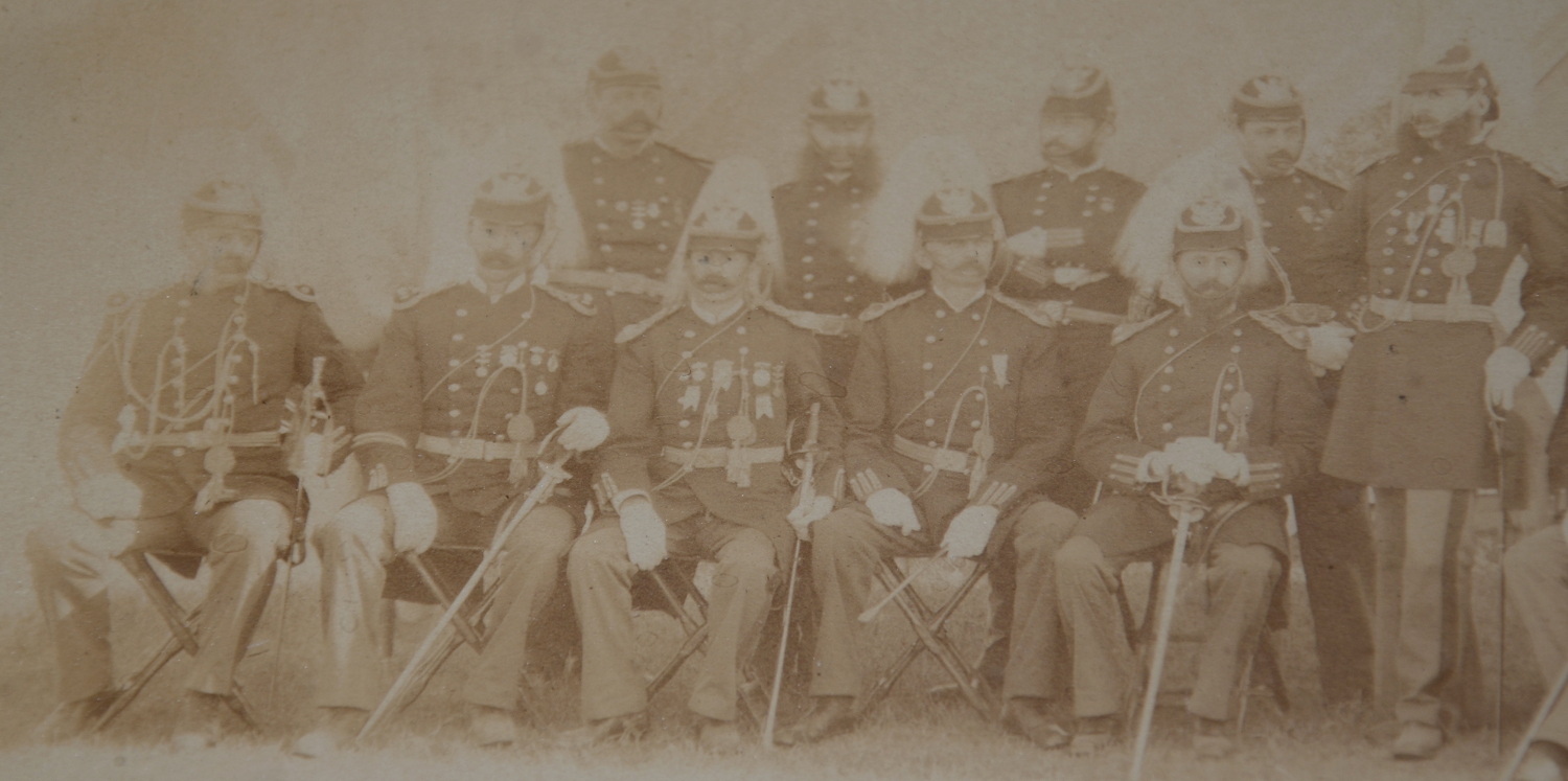 Image shows 18 officers arranged in two rows with the front sitting and the rear rank standing. Standing at center is the commanding officer. All the officers pictured wear dark frock coats and light trousers. The officers in the front row wear 1880’s spiked helmets with large horse hair plumes and agaulettes. The lone exception wears a dark slouch hat. The officers in the back row wear the same helmets but without the plume. Many of the officers wear shooting medals and some wear what look to be medals with GAR stars attached. All in the front row wear Model 1860 Field & Staff Officer’s swords.