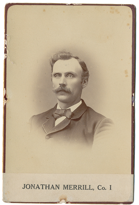 Image shows Jonathan Merrill of Company I. He wears a dark civilian suit with white shirt and bowtie. Bottom of the mount has a printed caption with his name and Company.