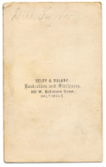 Carte de visite photograph of Taylor in uniform. Chest up view wearing frock with no insignia visible. Image is clear with very good contrast. Two small scrapes that are not near image. Mount is clean with bold printed border. Pencil identifications on front and back. Photographer's backmark, Selby & Dulany, Baltimore.