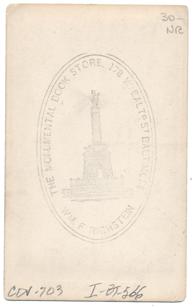 Oval bust view of Wise in civilian clothes. Photograph is clear with slightly light contrast. Printed identification on lower edge of mount. Photographer’s backmark: The Monumental Book Store, Baltimore.