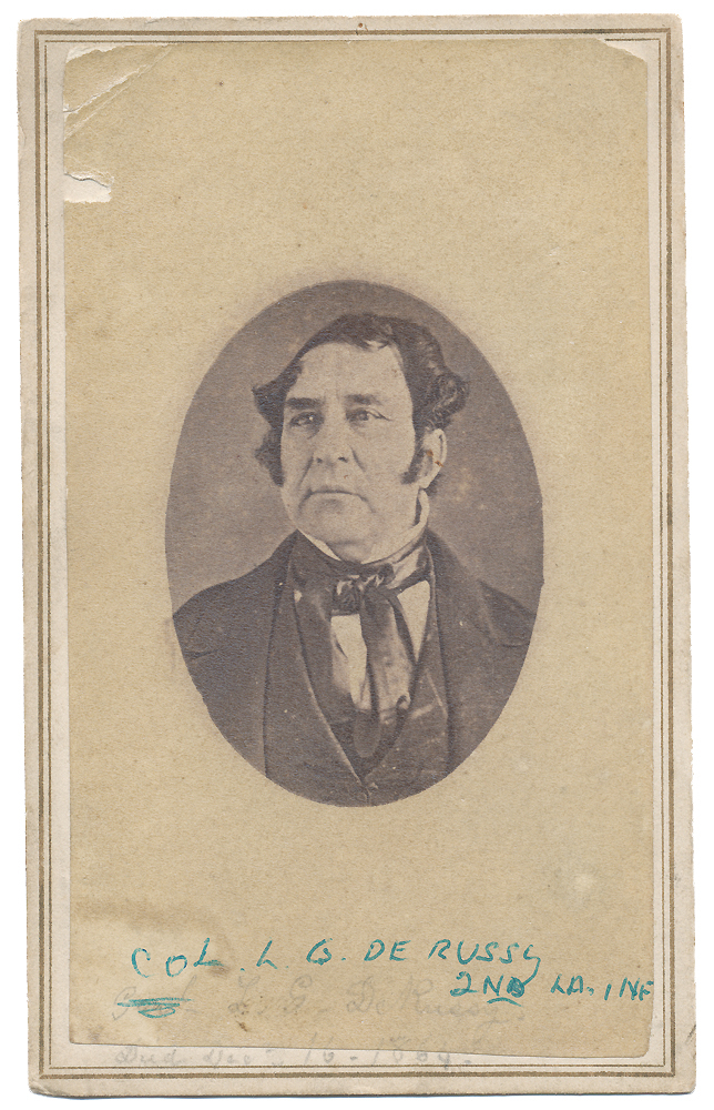 Oval view of DeRussy in civilian clothes. The image is clear with good contrast. There is a small wrinkle and chip to the upper, left corner of the image. A faint, but original pencil identification and date of death is found at the bottom of the image. Later, a more visible ink identification was added with some "corrections". Photographer's backmark, A.D. Lytle, Baton Rouge, LA. There is a 2-cent revenue stamp on the back, cancelled 1866. Another faint period pencil note is found on the back, "To Mrs. R.A. DeRussy, From C.D. DeRussy".
