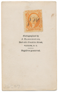 Reverse has a photographer’s imprint for J. HARRINGTON… WATKINS, N.Y. There is also an orange 2 cent tax stamp hand canceled by the photographer with the initials “J.H.” the tax stamp dates the photo from August of 1864 to August of 1866. [ad] [ph:L]