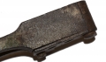 Iron bullet mold measures approximately 7 ½” long. Two halves pinned with rivet and has floating sprue cutter. Iron is pitted but not badly; could be “dug” or out of a barn. Still opens and closes easily. Cavities remain in good shape. Casts two types of .40 caliber bullet. [jet]