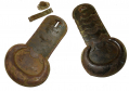 These are in very good “dug” condition, with a dark green-brown patina to the brass. The tops and bottoms of the crescents have separated. The iron strap on the underside is rusty but complete. The spring straps are still securely soldered in place on the underside.