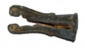 Made of pewter or zinc with a straight blade attached on side of the cone-shaped body. Decorative shapes cast on the sides including the letters “SC” in an oval on the front.