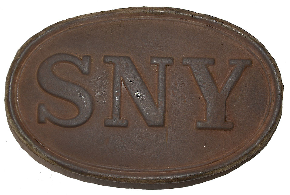 This is an original Civil War oval “SNY” waistbelt plate issued by the state of New York to its early war volunteer regiments that was recovered at Fredericksburg. The overall pattern was adopted by the state about 1840 in the small size adopted by the US Army in 1839, substituting the abbreviation for State of New York in place of the US. These larger oval SNY plates were first adopted in 1858 for the wider belts and in 1861 the state contracted for some 33,000 from three different contractors to equip its early-war volunteer regiments.