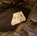 The cap has excellent color and only minor stains or dust and some minor moth nips on the wearer’s right side, and a few on the rear of the top and two-thirds of the way down the back on either side of the seam, a few of which have been backed with small bits of matching cloth. The seams are tight. The visor is firmly in place. The interior lining is very good, as is the sweatband, both firmly in place. The chinstrap is secured with two small general service eagle buttons, uses a standard floating friction buckle and two stop loops, and appears to have some age. Some connoisseurs would argue it is likely a replacement and that Murphy and Griswold used only chinstraps with a fixed friction buckle and one retaining loop, though with the company supplying more than 500,000 caps and known to have used subcontractors on occasion, there might be some variation.