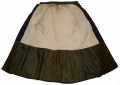 The body is fully lined in white in the sleeves and upper body, padded in the chest, and with a black lining now oxidized slightly toward green in the skirts. The body lining shows sweat stains on the back of the neck and upper chest, and has separated from the collar at the top of the neck in the back, now held by some safety pins. There is one small spot of fraying from this on the bottom of the collar lining at left rear, and there is small hole in the body lining about 1 ¼ inch in diameter in lower right back. We see just on small ¼ inch hole in the skirt lining in the left front. We see no interior breast pocket and no quartermaster or maker stamps, and we notice that the chest, while padded does not show lines of quilting, so the body lining may have been replaced or added over the original, and the small hole on the wearer’s lower left back seems to show quilting behind it. We see a stamp at the upper rear reading “Charles Chrisdie & Co.” which was a New York City theatrical costume rental company in the early twentieth century. They are well known among Civil War collectors as the source for many mint condition uniforms, and some equipment, they had bought as surplus as a cost-effective means of supplying Civil War or just military themed theatrical productions. As theatrical demand dropped off, collector interest picked up and in the 1960s and costume companies became a treasure trove for collectors and dealers: Norm Flayderman cleaned out much of Chrisdie’s inventory. In any case, we see some names and size stamps on the lining as well, so it is possible the body lining, and maybe the collar lining, too, were added by Chrisdie’s seamstresses to improve it for rental for stage use. We are certainly not about to remove the lining to check, but it is a good guess. In any case, the coat is a military issue coat bought as surplus for use in rentals, not a costume made up by the company. It displays well and would make a great addition to an Indian Wars US infantry display. [sr][ph:L]