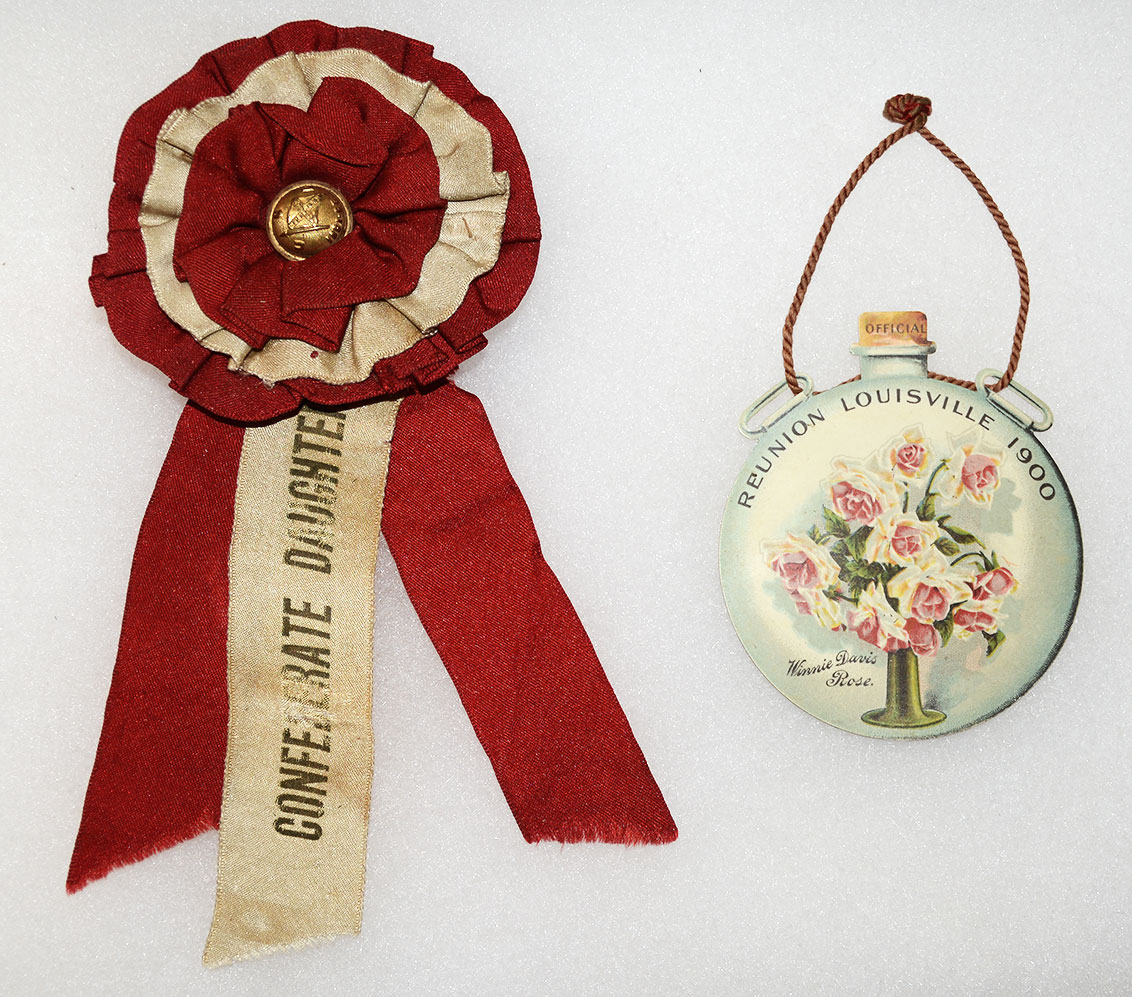 The official membership badge is canteen shaped, with a braided hanging cord. The condition is excellent, with no notable damage. The front shows a “DAUGHTER OF THE CONFEDERACY” with an engraving of a young woman, and the word “OFFICIAL” on the canteen’s cork. The reverse features a bouquet of roses, with a banner reading “REUNION LOUSIVILLE 1900”, and the name “Winnie Davis Rose” in script.