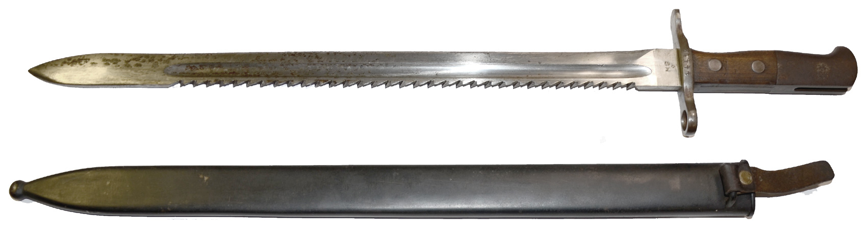The drawn bayonet meas. approx. 23.75 inches long from point to pommel. The blade is 18.75 inches with a sharp nasty sawtooth top edge. The true edge is free of nicks and shows signs of sharpening. The blade surface is bright with spotted mottling over the bottom third. One side of the ricasso is stamped with an “HS” over a Swiss cross while the other side is blank.