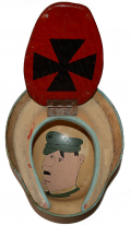 The whole piece remains in solid condition. There are some minor “rubs” and scratches to the paint on the steel helmet. There is also minor crackling on painted wood surfaces and some scattered light surface grime. The vents in the M35 helmet have been plugged and the liner rivets removed. Overall, whole structure is sturdy, paint color is bright, and caricatures fascinating.