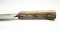 Wide bladed knife with rounded point designed to cut wood and bamboo to fashion temporary splints, poles, stakes, stretchers, or whatever else might be necessary to aid or evacuate a casualty in the dense jungles of the Pacific islands. These were made by several makers in both bright and dull finish. This one was made and marked on the left by Chatillon N.Y.- John Chatillon & Sons, established in 1835- with the company name under “U S M C” in larger letters. The blade is one of those made in a dull finish and shows as muted silver gray with small darker gray age spots, more on the right than on the left. The edge along the bottom and around the tip is good. The wood grips are secured by three rivets. The grips are secure and have no chips or cracks, but the finish is gone and there is some thin brown rust on the edges of the blade tang between the grip slabs, which also show a slight gap at the pommel.